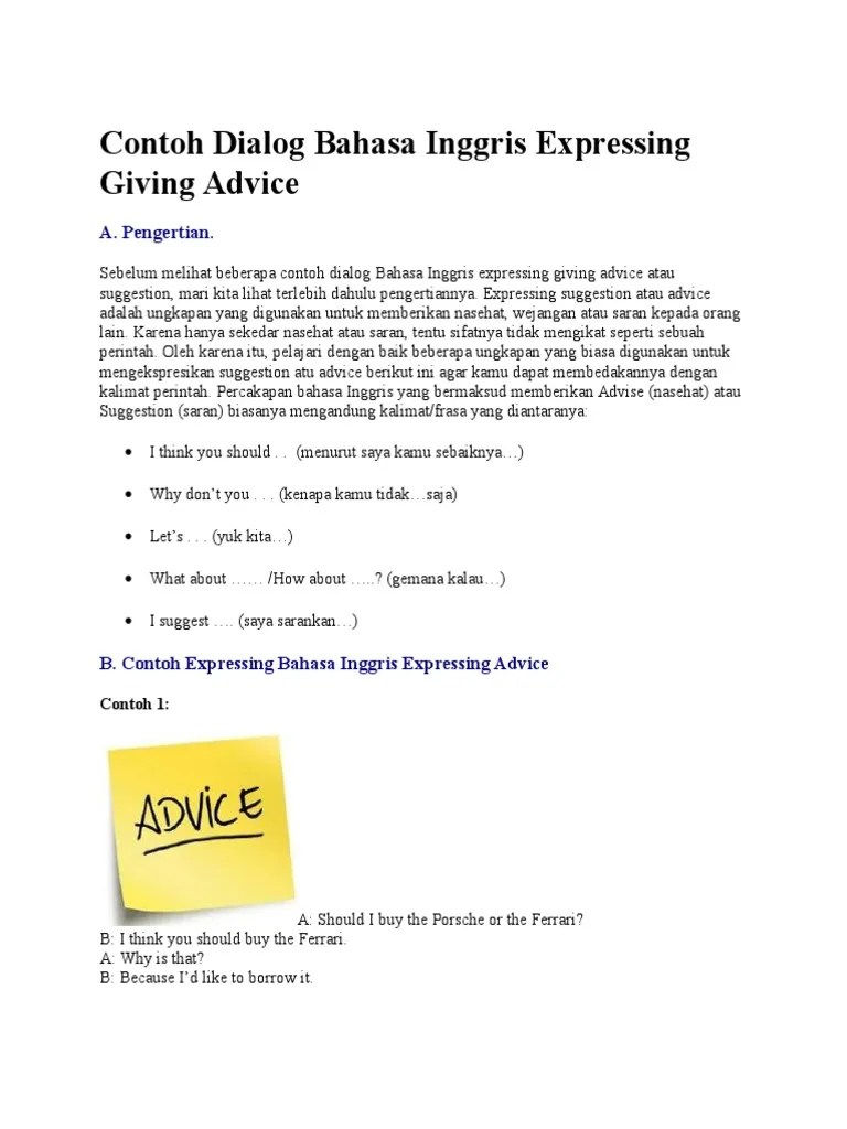 Beragam contoh dialog asking and giving suggestion or advice, dialog untuk 2 orang panjang, dialog untuk 3 orang, dialog untuk 5 orang. Contoh soal tentang giving advice + the use of should and shouldn't Berikutnya juga diberikan beberapa contoh percakapan pendek bahasa inggris sebagai bahan ajar untuk asking and giving advice dialogue. It might be a good idea to put . · you'd better brush your teeth regularly. A good café around this hotel? I would like you to take this medicine three . Giving advice · if i were you, i would go to the dentist. · why don't you go to the dentist? (recommend / recommendation) · do you have any. Contoh expression of giving advice. Asking for and giving advice , meminta dan memberi nasihat dalam bahasa inggris , contoh dialog asking for advice , giving advice and . Contoh soal asking and giving advice · could you.